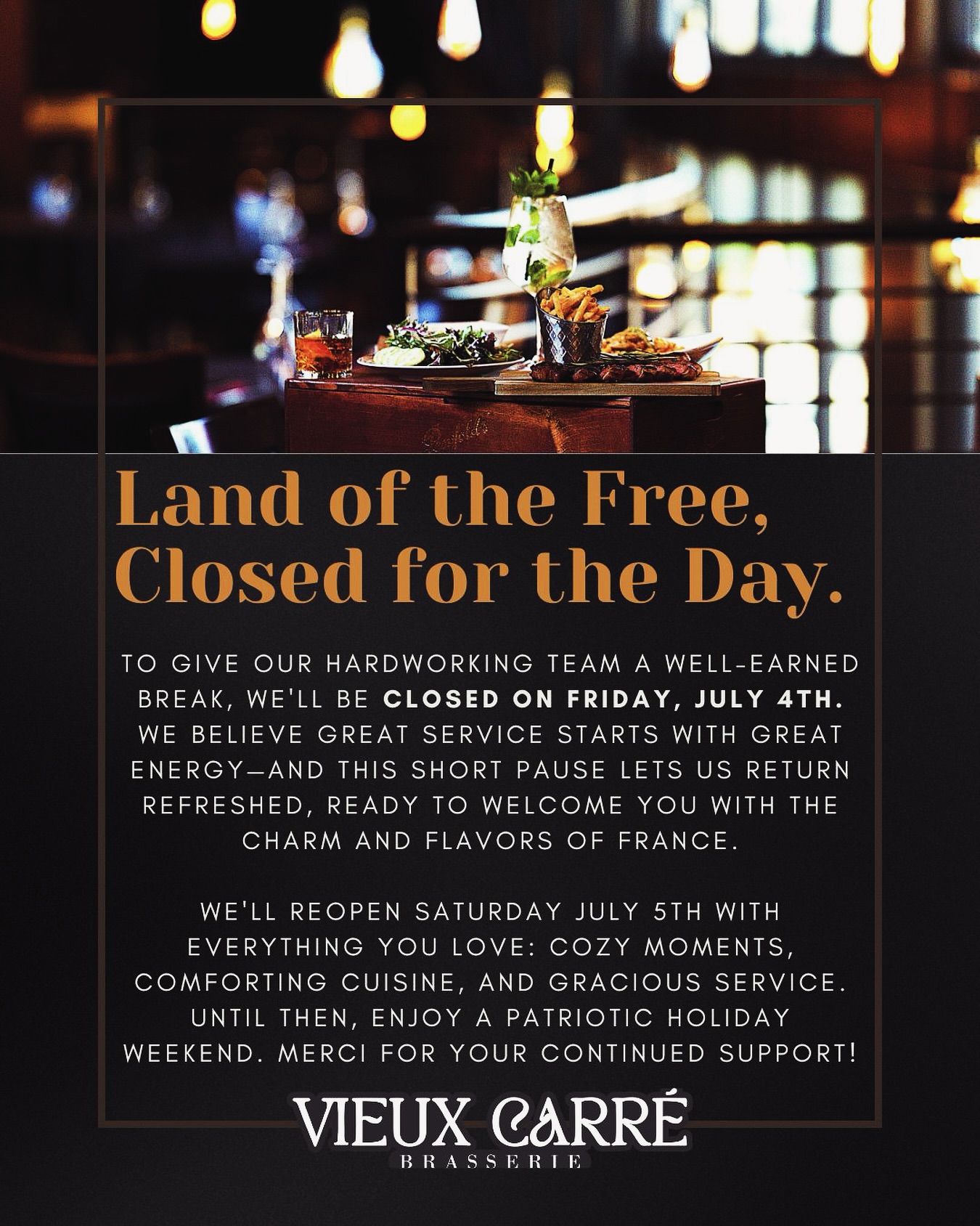 Vieux Carré invites you on an adventure, blending French sophistication with a touch of originality. Our carefully crafted recipes will give you an unforgettable culinary adventure, leaving an impression on your palette. Elevate your experience with our exquisite cocktail creations expertly crafted by our talented mixologists, and ensure not only drinks, but pleasant interactions. From timeless classics to innovative signatures, our wine selection boasts a well-prepared variety of French wines that pair with our food, enhancing every bite. Immerse yourself in an atmosphere refined with attention to detail, stimulating lighting and lively music. Our knowledgeable staff, well-versed in French food and drink, are ready to enhance your visit with personalized recommendations and lively conversation.